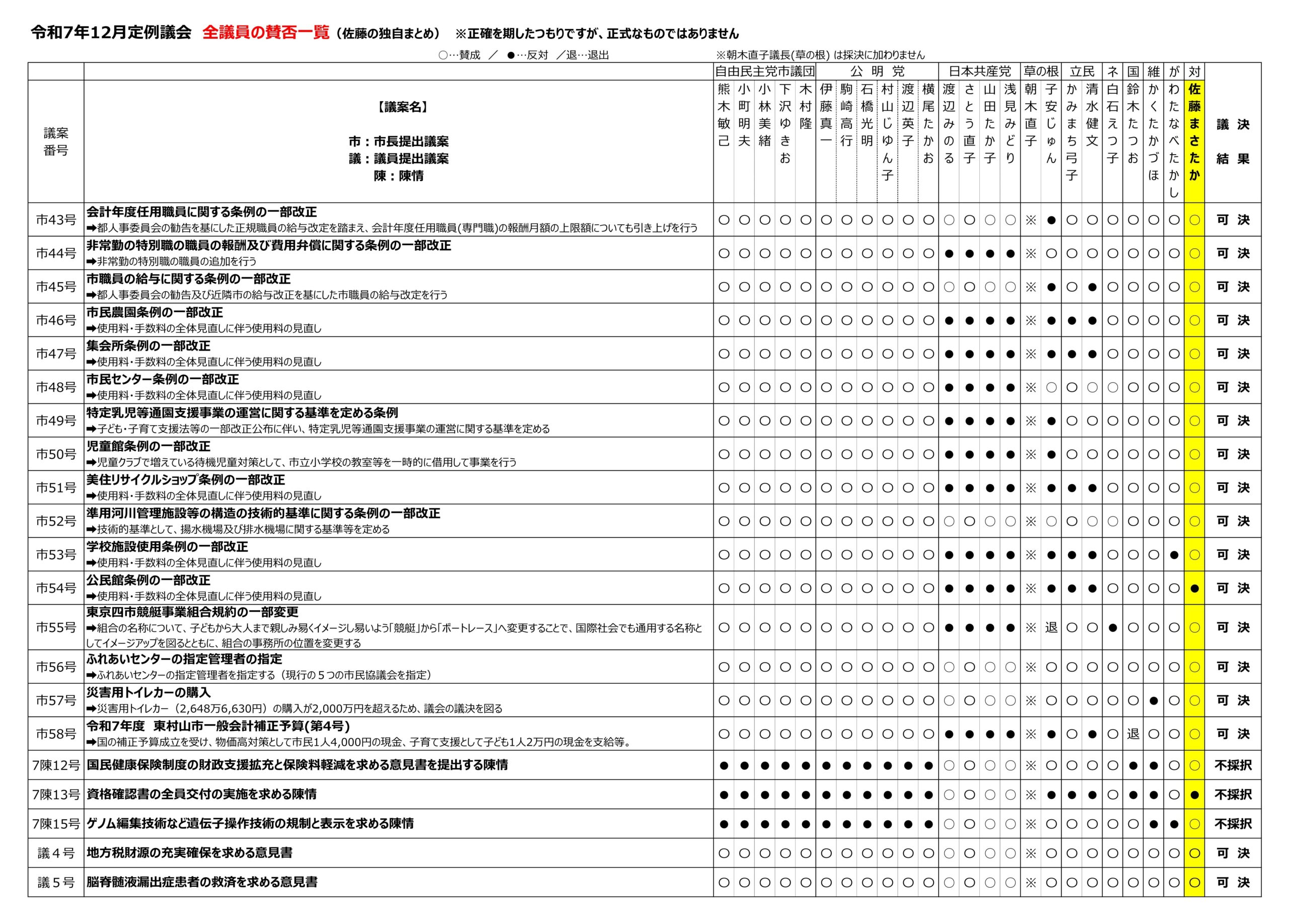 いつものように全議員の賛否一覧を作成しました。初日は既に公開されている動画を、最終日はメモを取り続けて何度も確認をしましたが、もし間違いがあった場合はお詫びの上で速やかに訂正します。