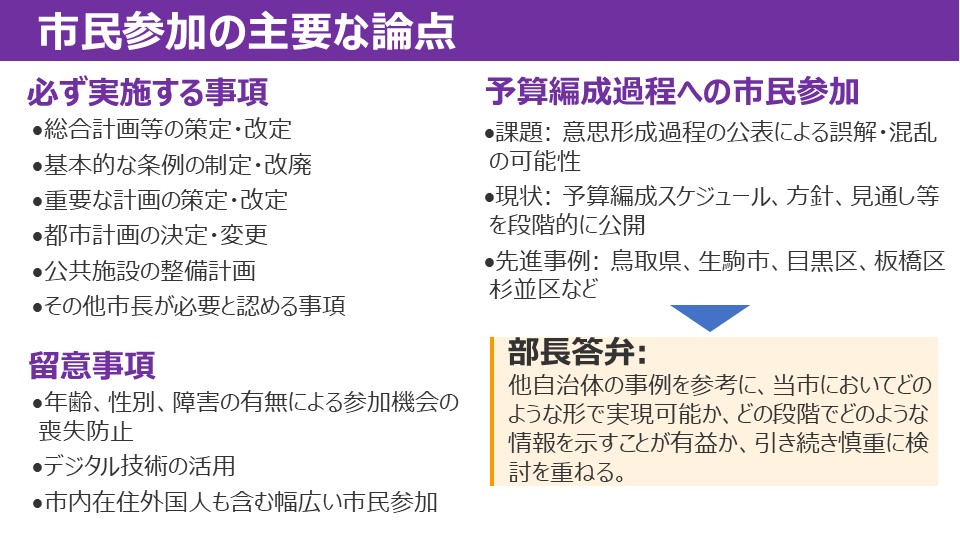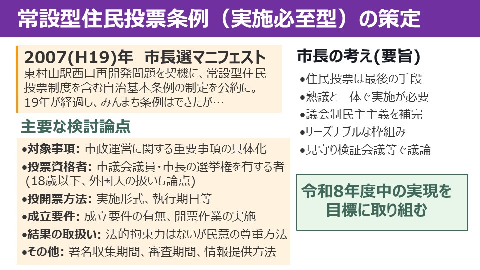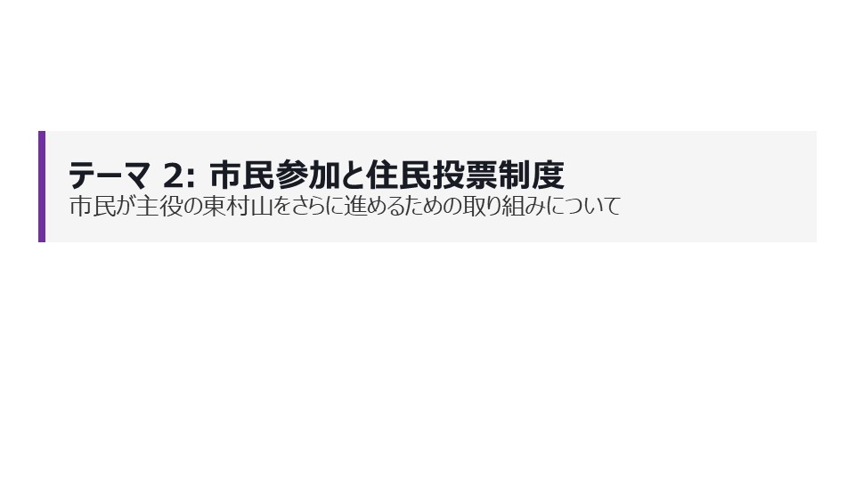 今回のテーマは「葬祭場(火葬場)整備と補助制度の必要性を問う」と「市民が主役の東村山をさらに進めるために」という全く趣の違う2つ。
