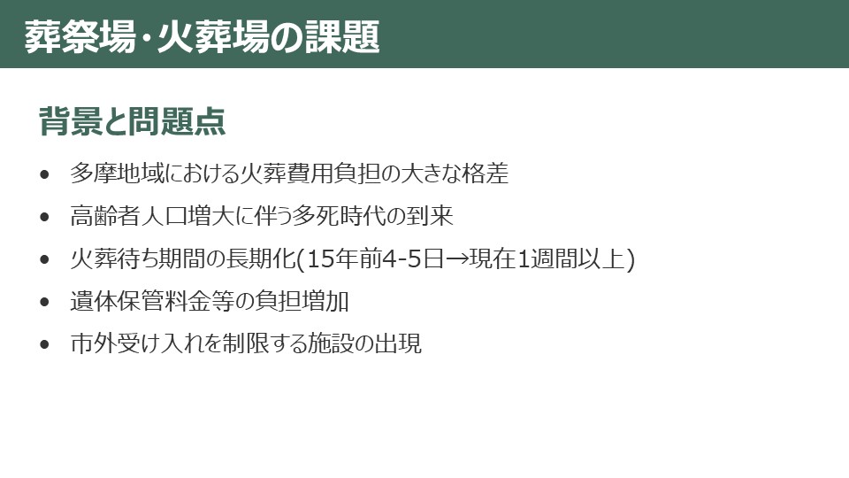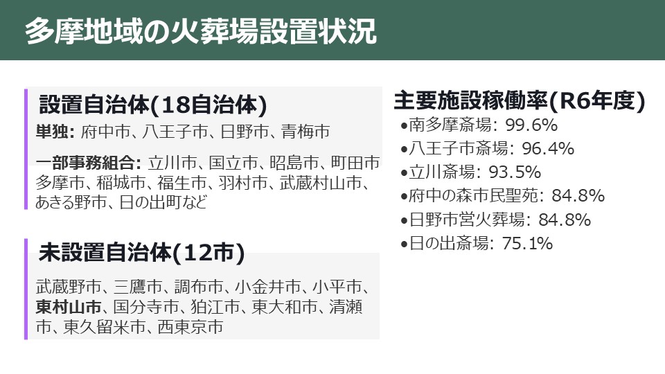 【公営火葬場の設置状況(多摩地域)】公営:計8カ所/うち単独設置(4):府中市、八王子市、日野市、青梅市/一部事務組合(4):立川市・国立市・昭島市・あきる野市・日の出町・奥多摩町・檜原村・八王子市・日野市・町田市・多摩市・稲城市・瑞穂町・福生市・羽村市・武蔵村山市(16自治体関与)/未設置自治体(12):武蔵野市、三鷹市、調布市、小金井市、小平市、東村山市、国分寺市、狛江市、東大和市、清瀬市、東久留米市、西東京市