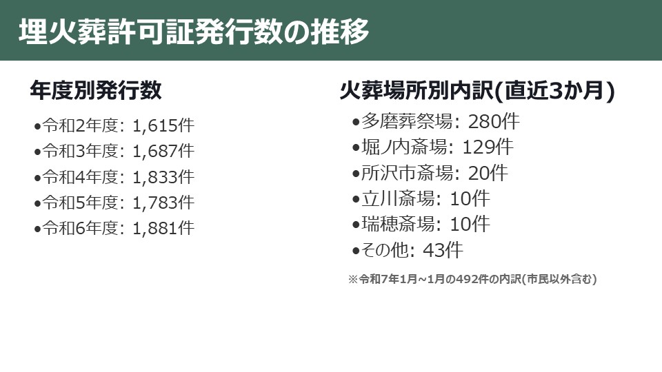 【埋火葬許可証の発行状況から】件数(市外分含む・経年)令和2年度1,615件/令和3年度1,687件/令和4年度1,833件/令和5年度1,783件/令和6年度1,881件