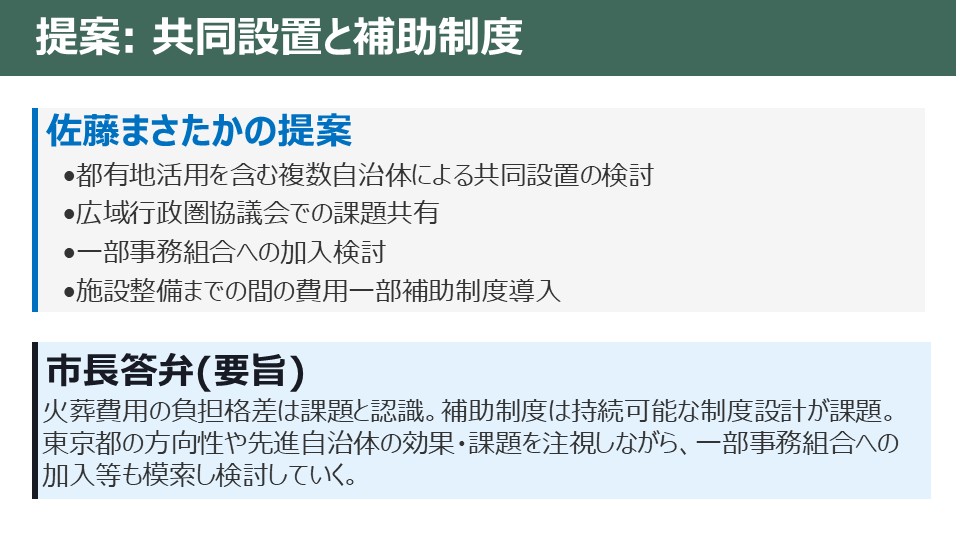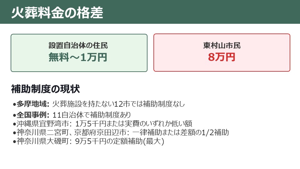 【補助制度の状況】多摩30市町村内:日野市とみずほ斎場一部事務組合に限定的な補助あり(施設工事・故障等で他施設利用時の補助)/火葬施設未設置の12市(当市含む)には補助制度はなし/全国の未設置自治体のうち11自治体が導入(例:宜野湾市は1万5千円または火葬料等のいずれか低い額、二宮町・京田辺市は一律または差額の1/2補助)。大磯町では9万5千円の定額補助との情報(議員言及)