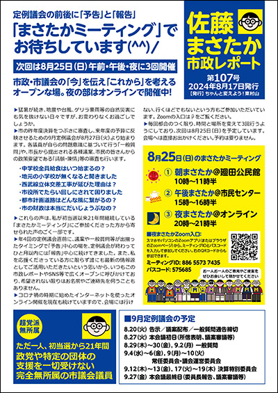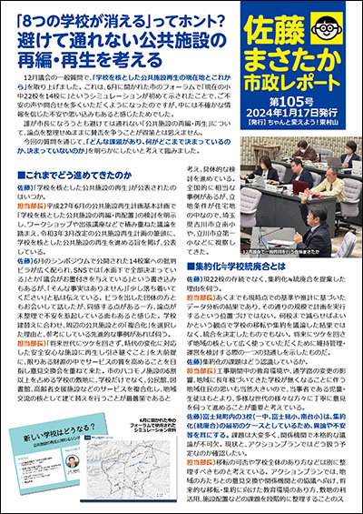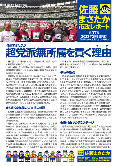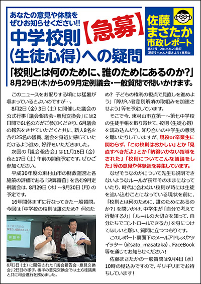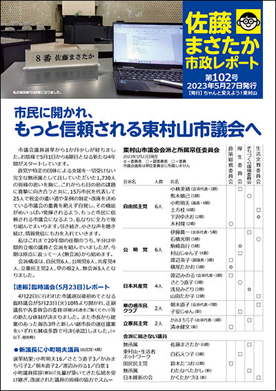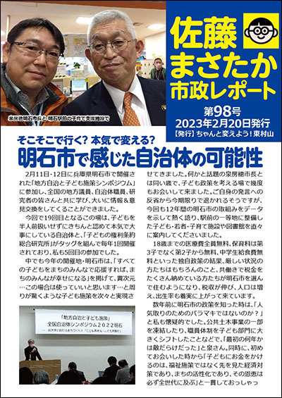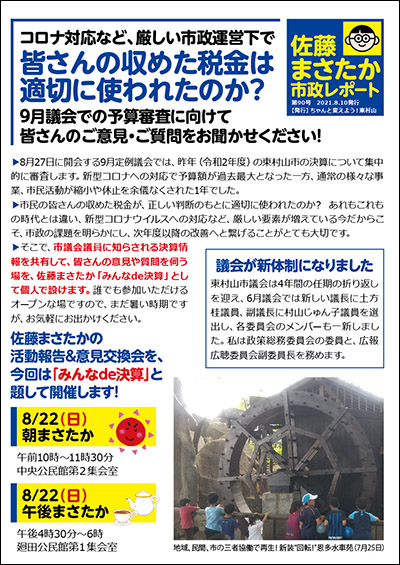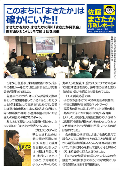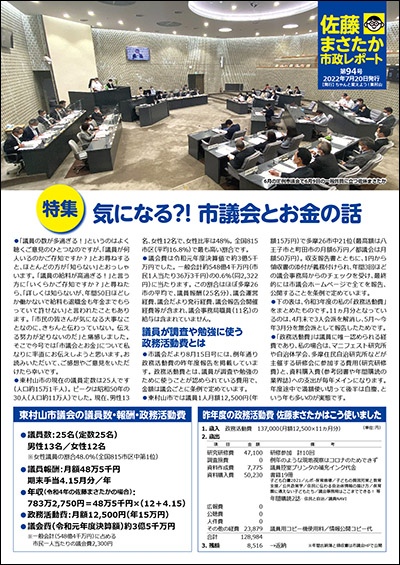 ●特集 気になる?!市議会とお金の話 ●多磨全生園の将来構想に市議会は何ができるか 超党派の市議9名による「政策研究会」始動! ●東村山市の各機関に請願・陳情を出してみませんか? ●深層レポート第2弾 見当違いの批判で社会の前進を阻もうとする議員たち ~今、東村山市議会で起こっていること~ ●全国議会改革度調査の結果公表!第1位は2年連続で取手市 東村山市は今年も下落 ●6月定例議会レポート 佐藤まさたかの一般質問は「公益施設サンパルネの見直し」「指定管理者制度のあり方」「子ども・若者政策の転換」