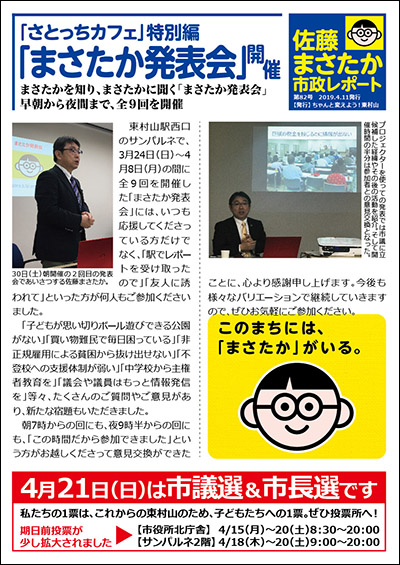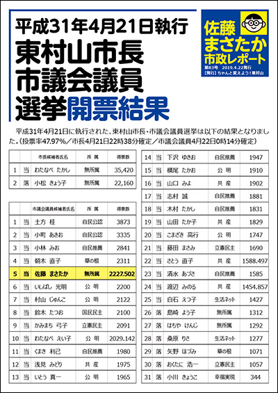 ●平成31年4月21日執行 東村山市長市議会議員選挙開票結果 ●さとっちカフェSPECIAL「まさたか報告会」にお越しください