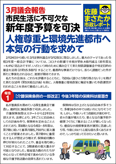 ●3月議会報告 市民生活に不可欠な新年度予算を可決 人権尊重と環境先進都市へ本気の行動を求めて ●地方議会と会派の話 ●実効性ある受動喫煙対策を!