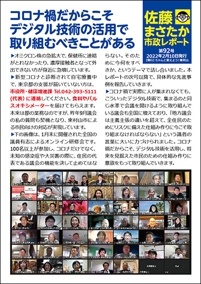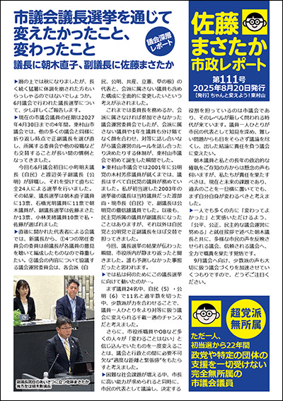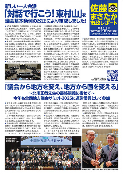 ●新しい一人会派「対話で行こう!東村山」を議会基本条例の改正により結成しました! ●「議会から地方を変え、地方から国を変える」~北川正恭先生の最終講義に寄せて~ 今年も全国地方議会サミット2025に運営委員として参加 ●「知る、伝える、広げる 多磨全生園の地元議会として」~全国で読まれる地方自治の専門紙「自治日報」第4338号「議会欄」に掲載いただきました~