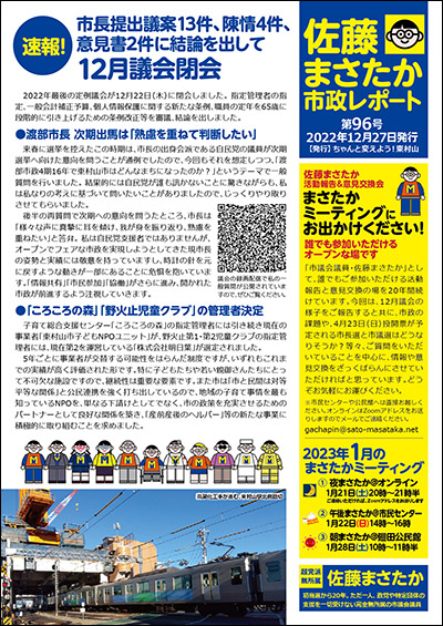 ●速報 市長提出議案13件、陳情4件、意見書2件に結論を出して12月議会閉会 ●佐藤まさたかが勝手に選ぶ2022年市政10大ニュース