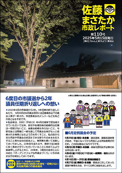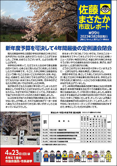 ●次世代に手渡そう! グリーンインフラ 新年度予算の“緑と公園”にズームイン! ●深層レポート 変化を望まない人々 東村山市議会で今起こっていること ●3月議会、佐藤まさたかの一般質問 今改めて問う。保育園は誰のため、何のためにあるのか。