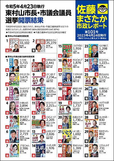 ●令和5年4月23日執行 東村山市長・市議会議員選挙開票結果 ●まさたかミーティングSP“選挙報告会”にお越しください