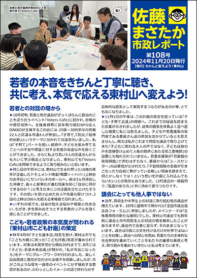 ●議会深層レポート 市議会議長選挙を通じて変えたかったこと、変わったこと 議長に朝木直子、副議長に佐藤まさたか ●東村山市では初!「こどもの権利シンポジウム」が開かれました