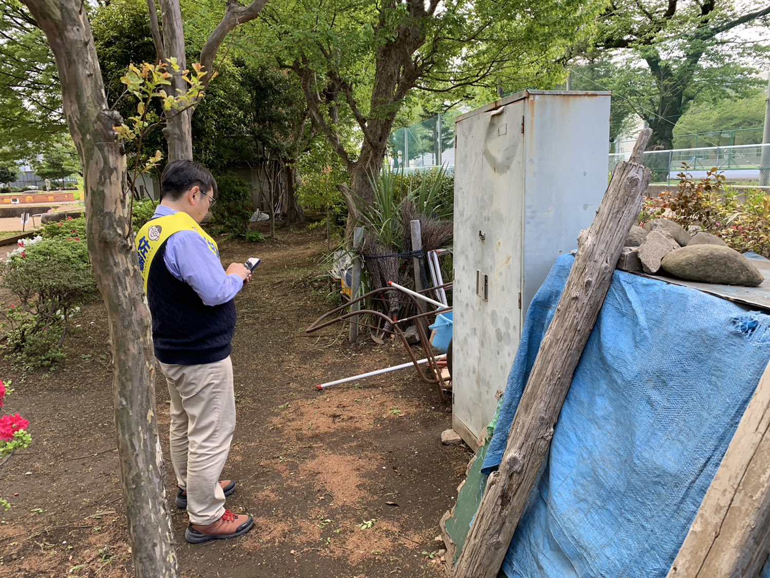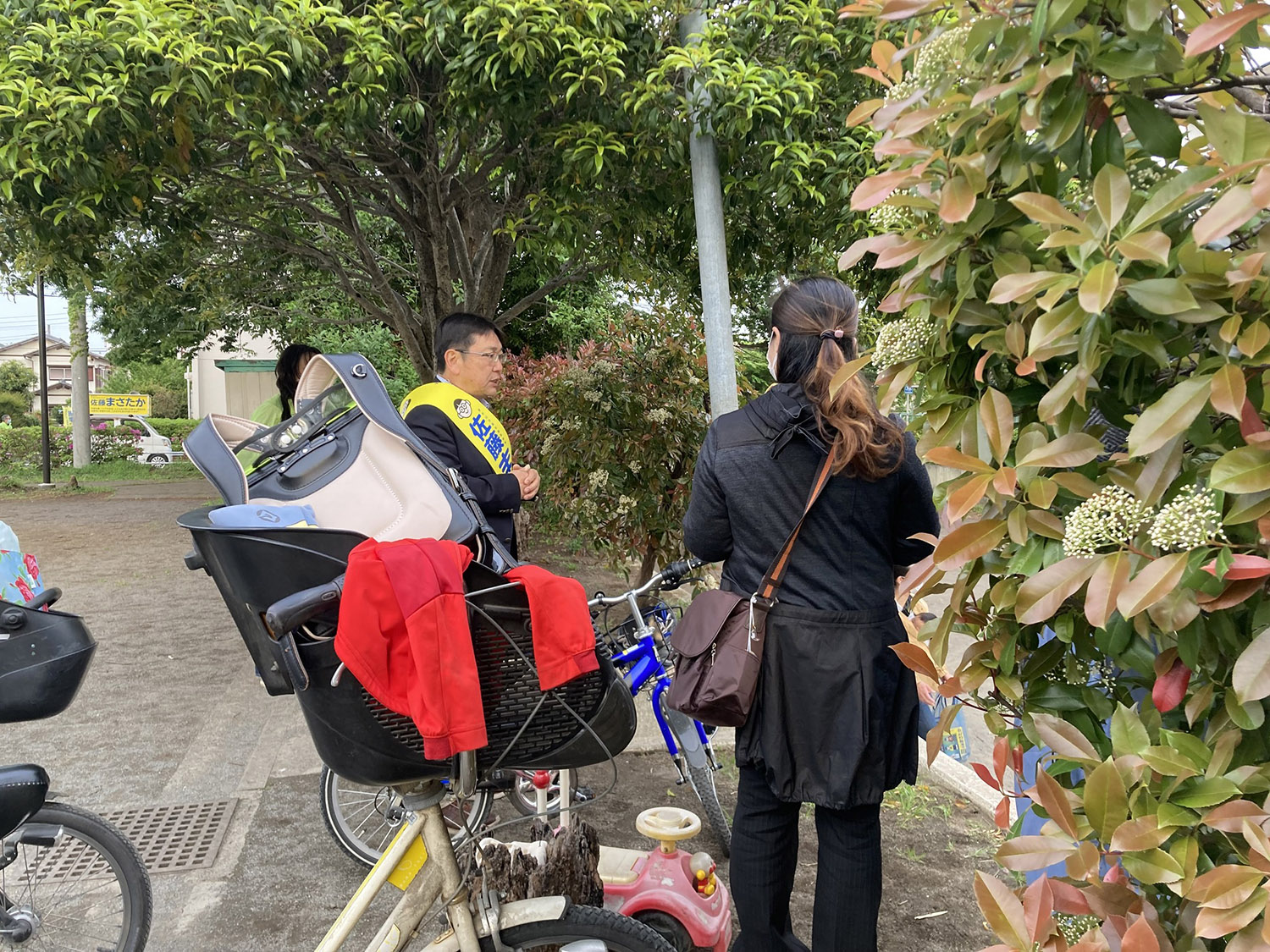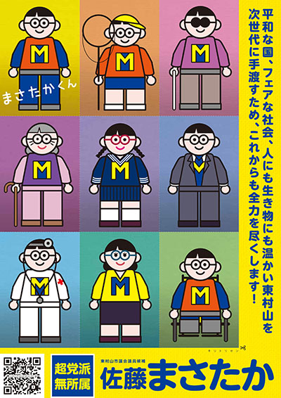 公園で遊ぶ子供たちに、様々な「まさたかくん」が描かれたチラシを配って、市議の役割について丁寧に説明する 佐藤まさたか。最後には子供たちから拍手が起こりました。(Youtube動画)