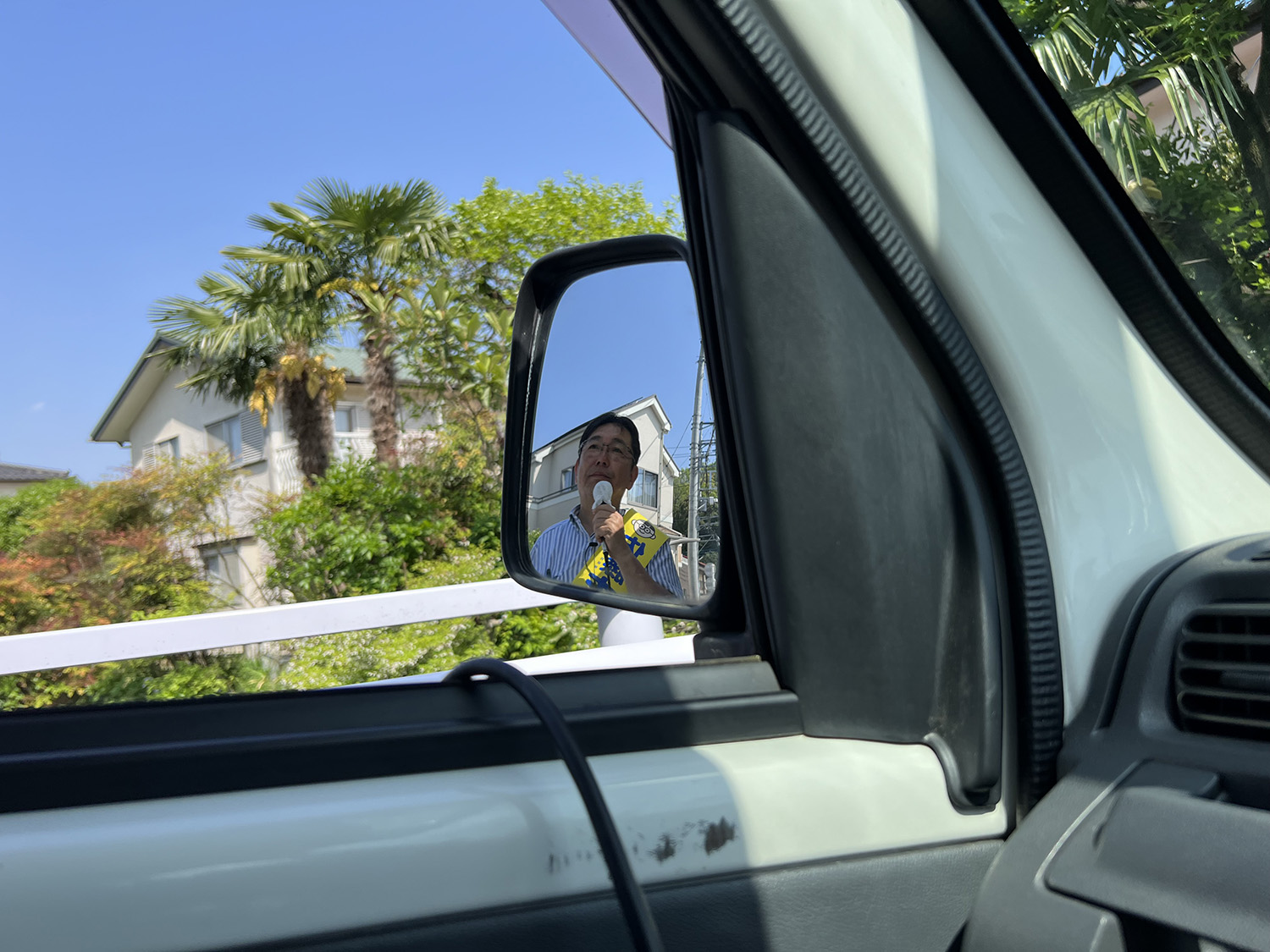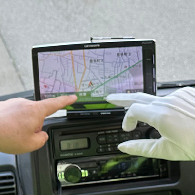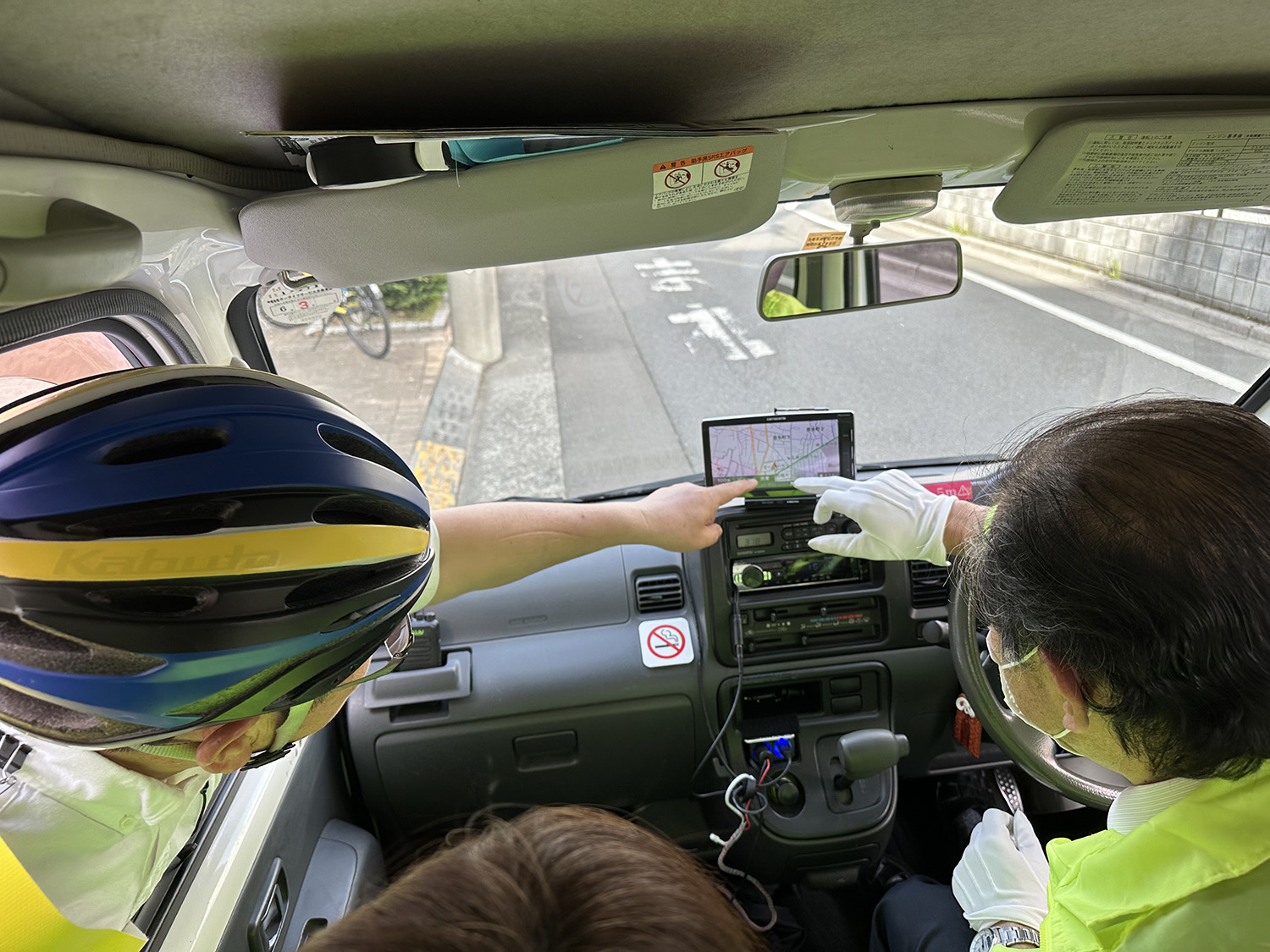 カーナビを見ながら状況に合わせて遊説コースを検討しています。